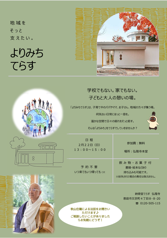 こんにちは! 本日1月25日は第1回よりみちてらすを開催しました✨ 今回のよりみちてらすでは、切り花販売を行いました。 悪天候の中、来られたお客様は多くはありませんでしたが、皆様笑顔で過ごされておりました♪ 次回は2月22日(日)になります! この日は秋山住職による法話を開催いたします✨ 住職へのご質問も随時募集しておりますので、ご質問のある方は納骨堂てらす恵庭までお越しくださいませ! 皆様のご来館お持ちしております😊
